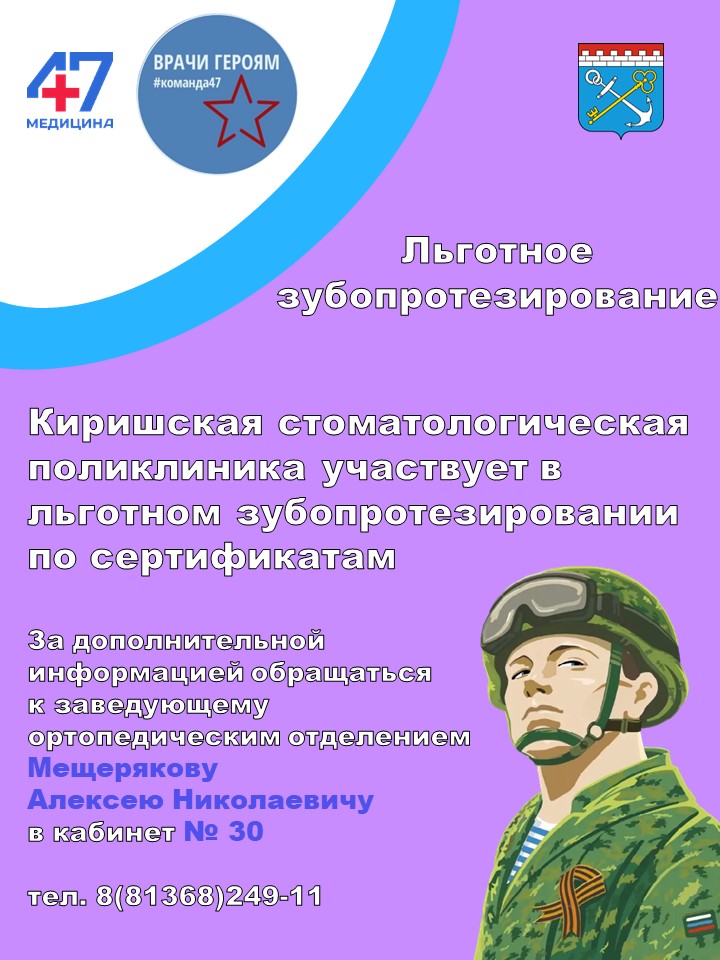 В соответствии с Постановлением Правительства Ленинградской области, реализуется мера социальной поддержки участников специальной военной операции в виде предоставления сертификата на бесплатное зубопротезирование.